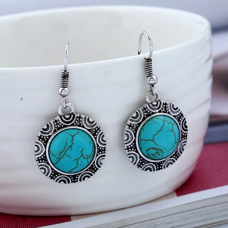 Skute Vintage Round Natural Sky Blue Stone Dangle Earrings For