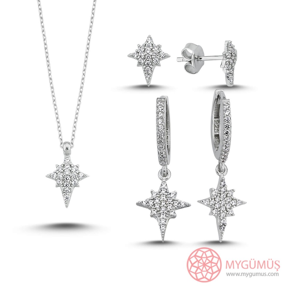 Zirkon Tasli Kutup Yildizi Gumus Kolye Kupe Set My101636 Mygumus Com